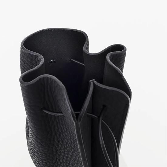 サステイナブルで革新的な革を生み出しているデンマークのecco社製のシュリンクレザー "DIPLO SKY”を使用。牛を育てることから行う同社は、自然の傷や肌質をそのままに、サステイナブルに特化した独自のタンニング製法で皮革を作り、その下地をベースにあらゆる仕上げのレザーを作ります。自然なシボ感を強調させたこの革は、部分によって若干の表情が変わりますが、タフな見た目にマットな質感が融合することで漂う上品さが、ほかにはない空気感を演出します。また、見た目に反した軽さが特徴の高水準レザーです。