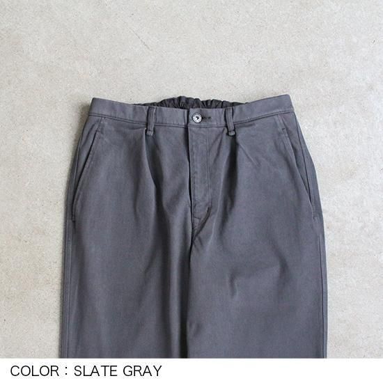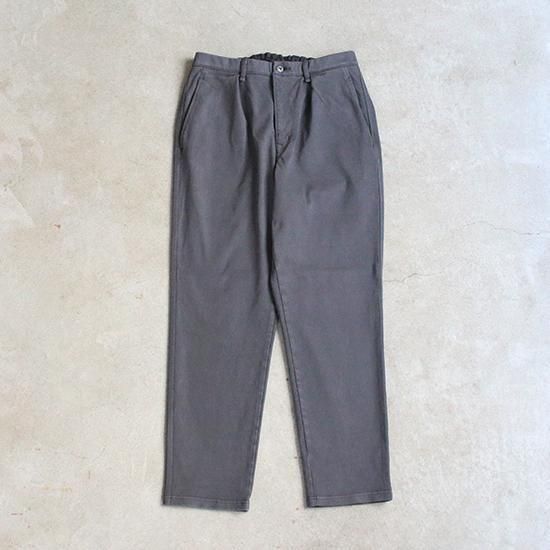 新色のSLATE GRAYカラーが登場。独自のストレッチインレイ素材を用いた1タックパンツ。ハイゲージで編み立てることで、ムラ感が強くハリのあるシャープな表情に仕上げています。編み素材ならではの柔らかい肌当たりと伸縮性を持ち、優れた着心地を実現。ウエストは1タック、後のみイージー仕様で腰周りに程良くゆとりを持たせ裾にかけてしっかりとテーパードを効かせたスラックスシルエット。型紙のベースはスラックスタイプを採用。カジュアルなアイテムはもちろん、シャツやジャケットなどにも合わせやすいシルエットになっています。