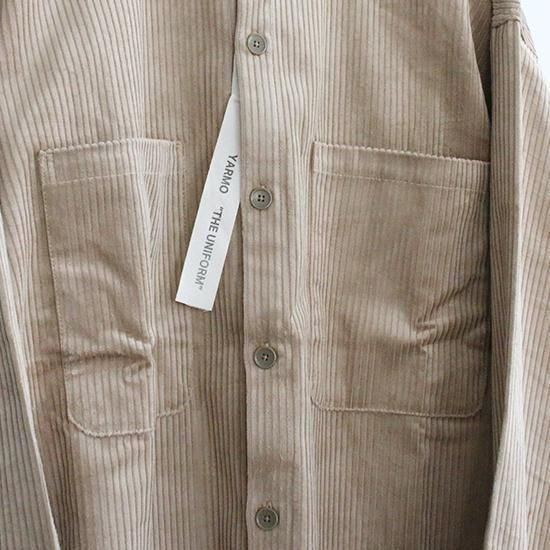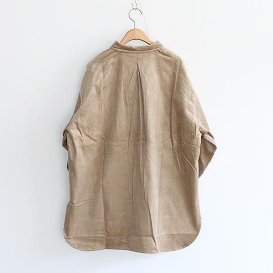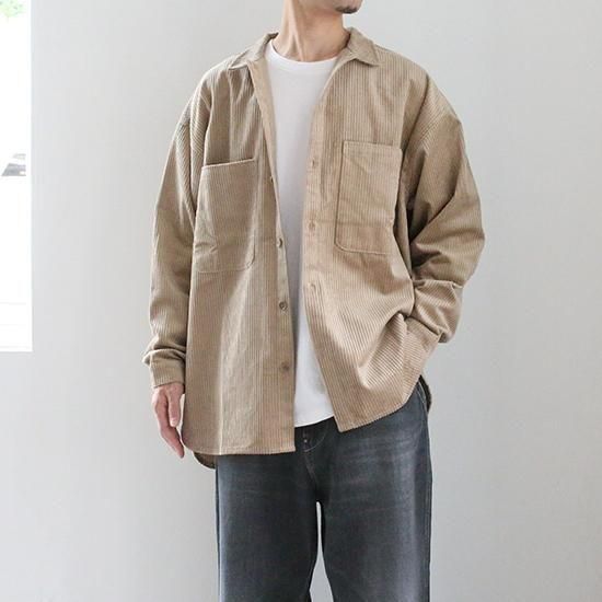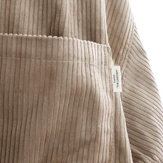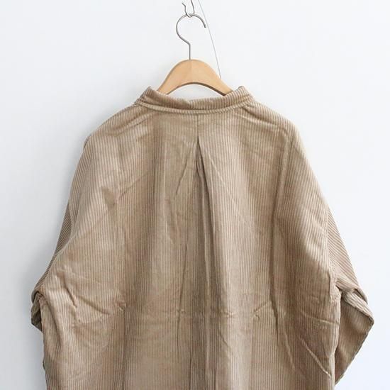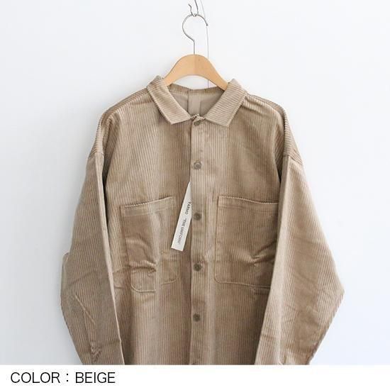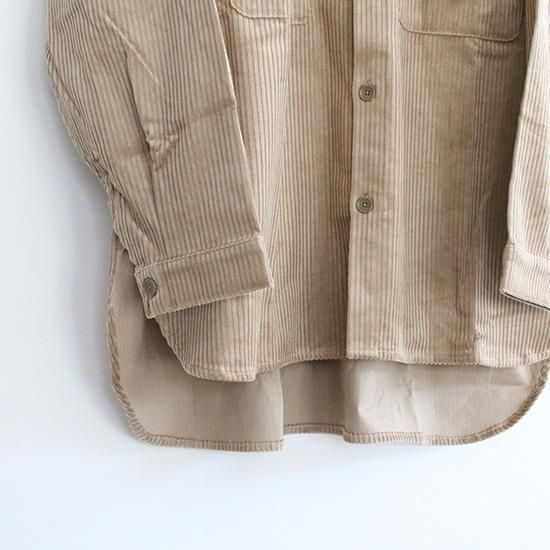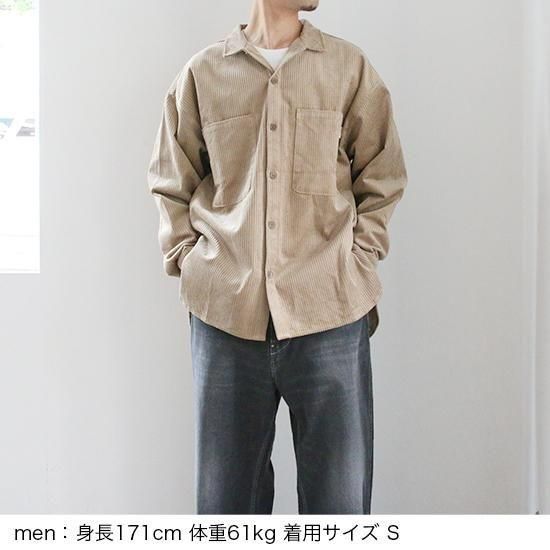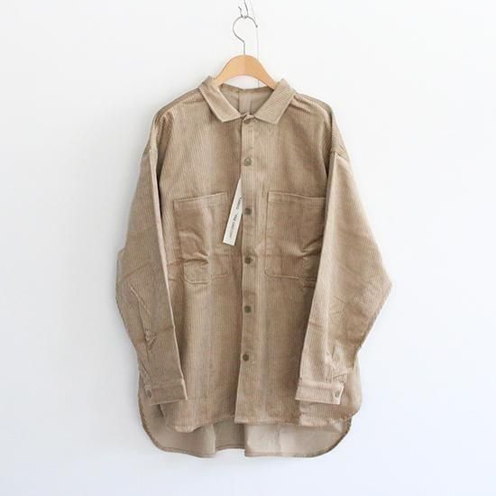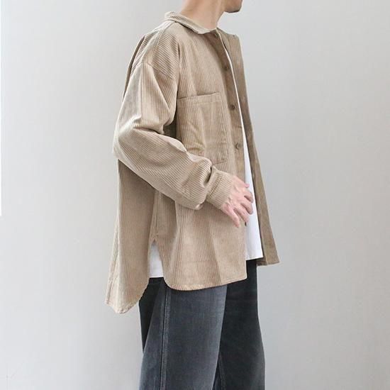ブリティッシュワークシャツをベースに、小さめの襟、ドロップショルダー、ややロング丈のシャツテールなど、シルエットバランスに拘った一着。男性にはルーズフィット、女性にはオーバーサイズで着用できるサイズ感です。光沢感のあるクラッシックなムード漂う、コットン100%のコーデュロイ素材を使用。程よい厚みのある生地感なので、軽めの羽織りとしても活躍します。