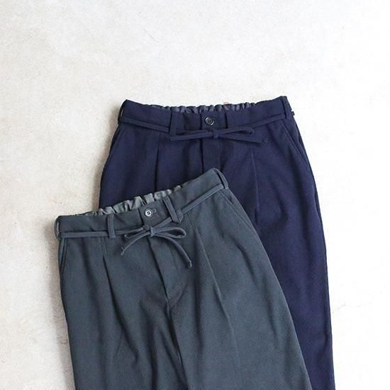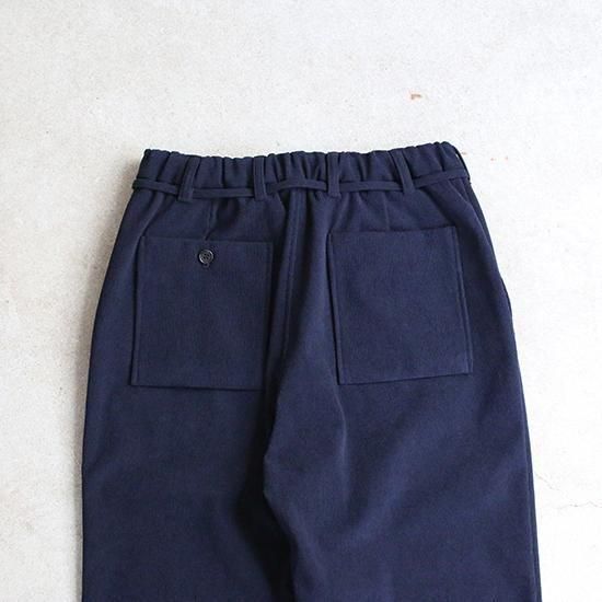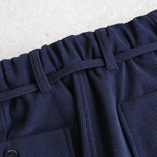 トリコット素材のポリエステルコーデュロイを用いたストレートシルエットのパンツ。布帛のコットンコーデュロイと比べると野暮ったくなくスッキリと見え、通常のパイルカットコーデュロイと異なり毛房が抜けることも無いので手入れも簡単。適度な張り感があるのでシルエットが綺麗に出ます。ポリウレタン未使用でナチュラルなストレッチ性も持たせているので、着心地も優れています。ベルトループ下部には共地のコードを通しているため、ベルトが無くても気軽に着用することができます。裾のドローコードでシルエット変化も楽しめます。後ろベルトのみにエラスティックバンドを使用したバックイージー仕様。