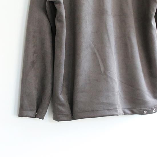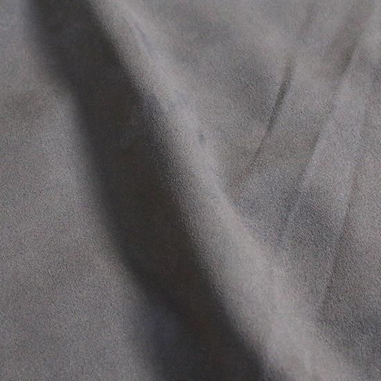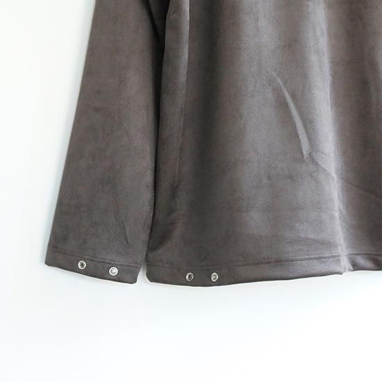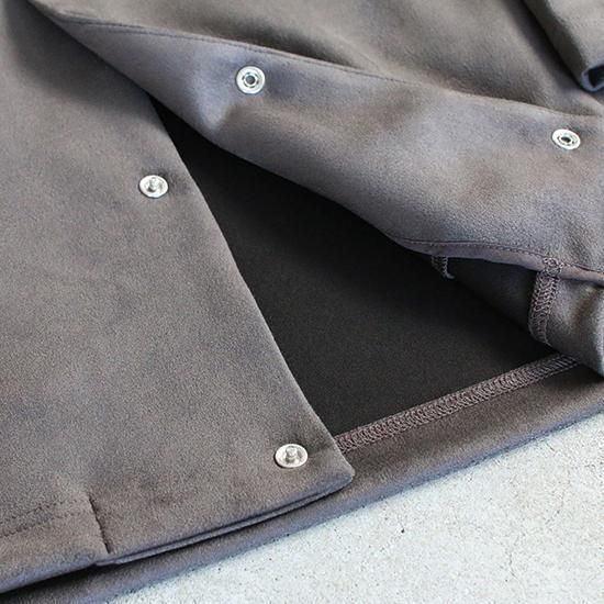 リサイクルポリエステル原料のダンボールスエードを用いたスナップボタン仕様のカーディガン。数シーズン定番アイテムとして展開しているデザインを今季はスエード調のダンボールニットにて製作。レザーの様な見え方はコーディネートのアクセントになりながらも、メンテナンスも気にする必要がなく取り扱いが楽。裏面は表側と違って起毛せずにツルッとしているので袖入れの滑りも良く、ポリウレタン配合により伸縮性に優れているので着心地は抜群です。カフスや裾のドットボタンを閉めれば丸みが出るので、シルエット変化を楽しむ事ができます。ウエスト部分にはシームポケット有り。