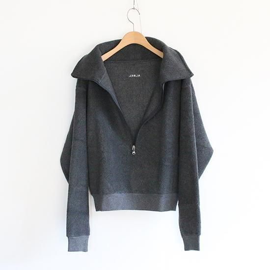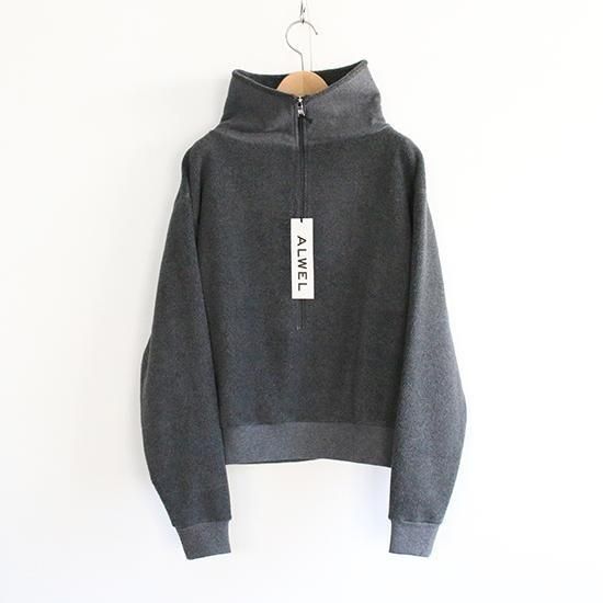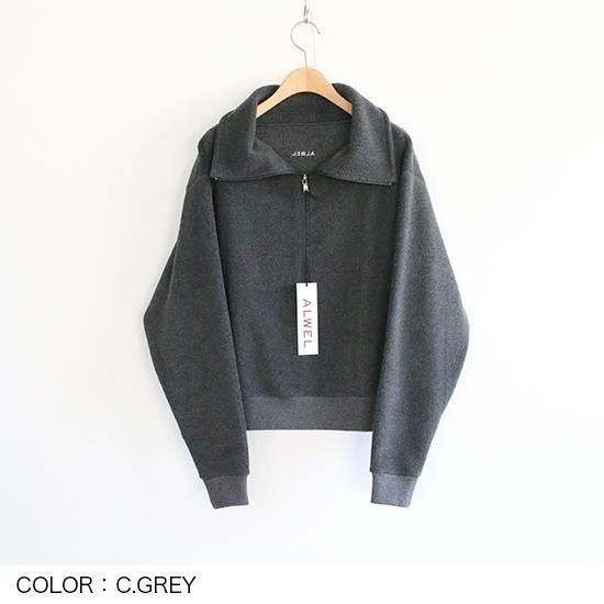 レーヨン混のフリース素材は軽やかで肌触りの良い着心地。ハーフジップファスナーをあしらいゆるめのハイネックで着ても、ファスナーを下げて衿のように見せても着用可能。バックにALWELの刺繍ロゴもさりげにアクセントに。ご自宅でお手入れが出来るのも嬉しいポイントです。