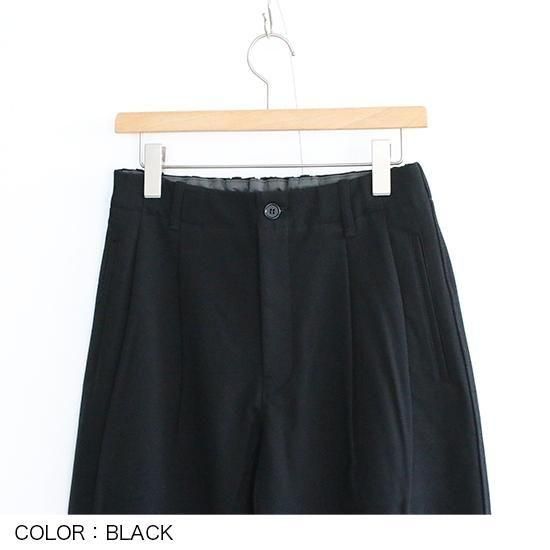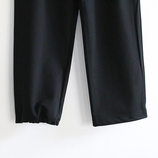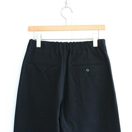 ニット素材のチノクロスを用いたワイドシルエットのパンツ。一見すると布帛に見えるチノパンは、超長綿とPBT繊維(ポリブチレンテレフタレート)という伸縮性のある糸を交編して編み立てられたニット製なので、適度な張り感を保ちながらも動き易くストレスフリー。2タックデザインで腰回りから全体的にゆとりのあるワイドシルエット。前ポケットは切り替えではなく片玉縁ポケット仕様、後ポケットは両玉縁仕様で左側のみ三角フラップ付き。ベルトはクラシックな裁ち出し仕様。裾のドローコードでシルエット変化を楽しめます。脇にはカットソー専用ミシンの象徴である飾り二本針のステッチを施しています。後ろベルトのみにエラスティックバンドを使用したバックイージー仕様。