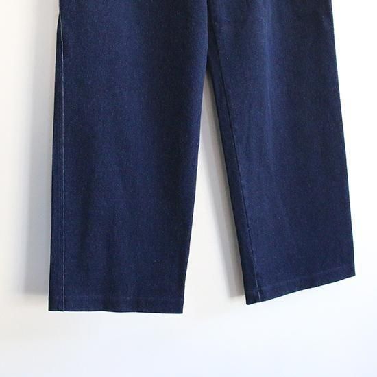 独自のストレッチインレイ素材を用いた2タックワイドパンツ。糸の表面だけが染まり芯部分は白いまま残るロープ染色された糸を使用し、深みのある色に仕上げたニットデニム素材。ハイゲージで編み立てることで、ムラ感が強くハリのあるシャープな表情に仕上げており、穿きこんでいくことで自然に色落ちし、味わい深い表情に変化していきます。編み素材ならではの柔らかい肌当たりと伸縮性を持ち、優れた着心地を実現。ウエストは2タック、後のみイージー仕様で腰周りにしっかりとゆとりを持たせたワイドスラックスシルエット。ウエストベルトを排除し、ベルトループを長く取っているのがアクセントで、タックインスタイルもお勧めです。型紙のベースはスラックスタイプを採用。